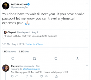 The lady tweeted her wish to go to Dubai next year. Luckily, Patoranking saw the tweet and replied to take care of the expenses if only she has a valid passport.