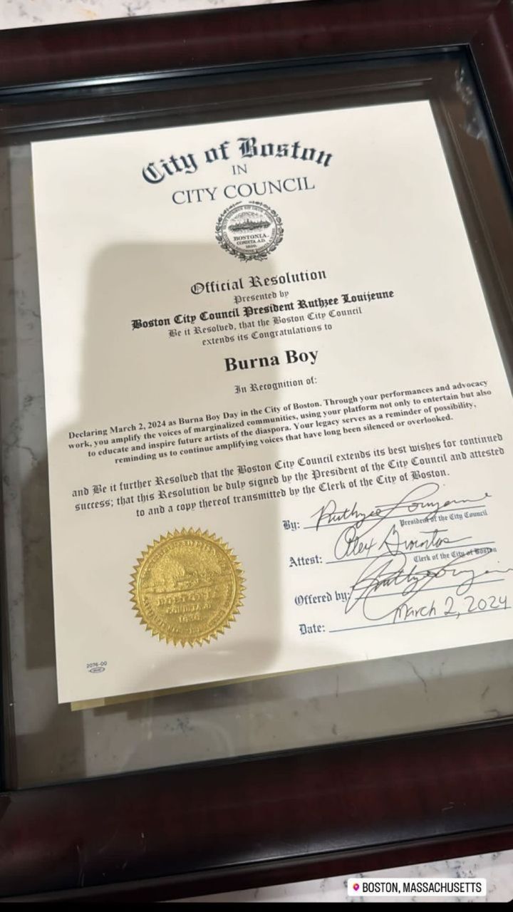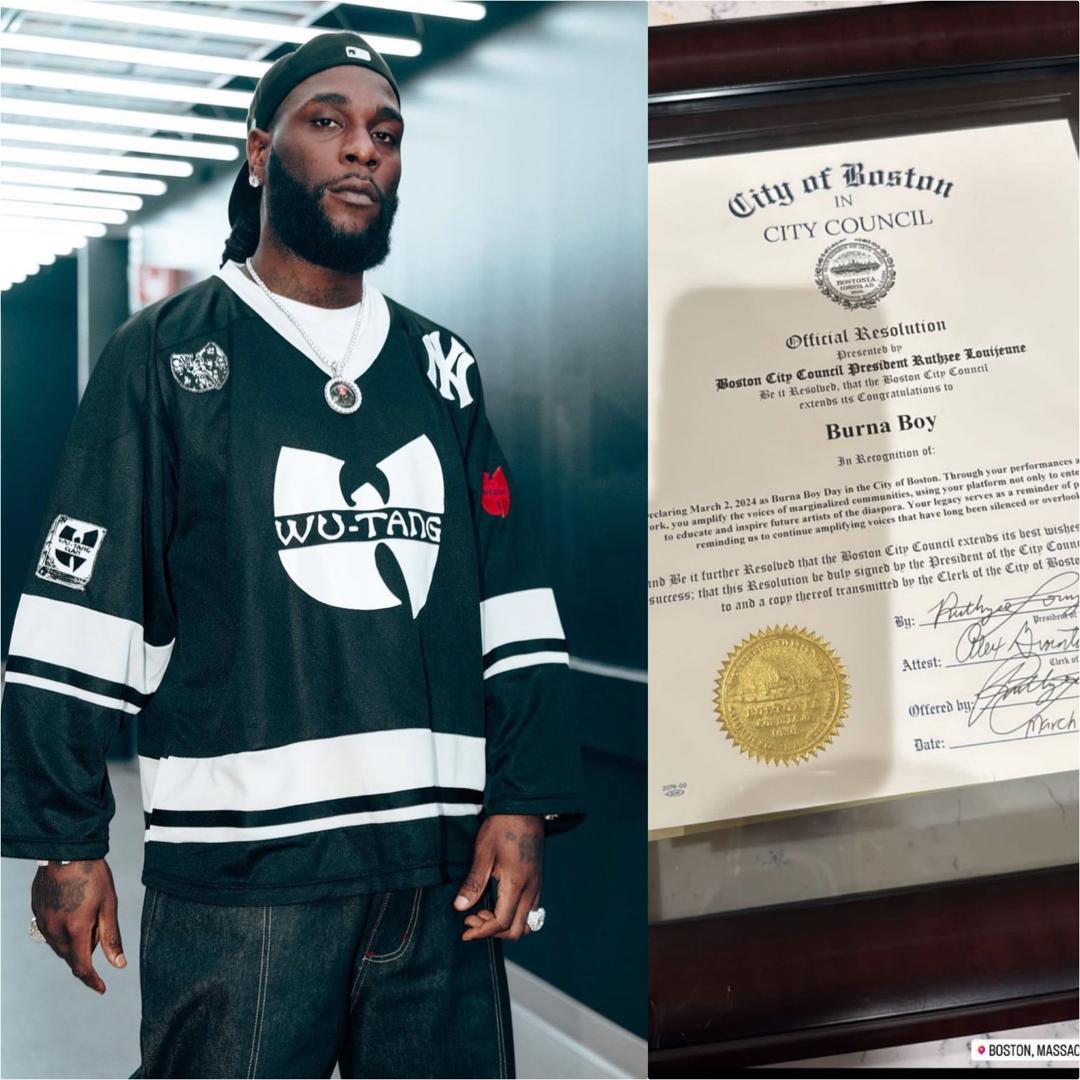 Reacting to this achievement, Burna Boy expressed his gratitude and feelings of honor. Boston officially declared March 2nd as Burna Boy Day, and the singer took to his social media platforms to share his sentiments.