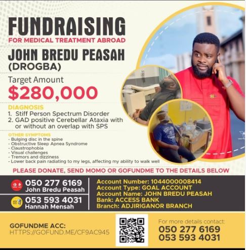 Ghanaian actor John Bredu Peasah, popularly known as Drogba from the hit TV series “YOLO”, has launched a GoFundMe campaign with the aim of raising $280,000 to fund his medical treatment overseas.