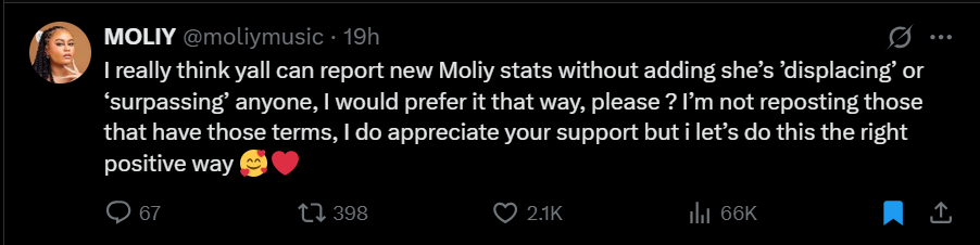 “I really think y’all can report new Moliy stats without adding she’s ’displacing’ or ‘surpassing’ anyone, I would prefer it that way, please ? I’m not reposting those that have those terms, I do appreciate your support but let’s do this the right positive way,” she said.