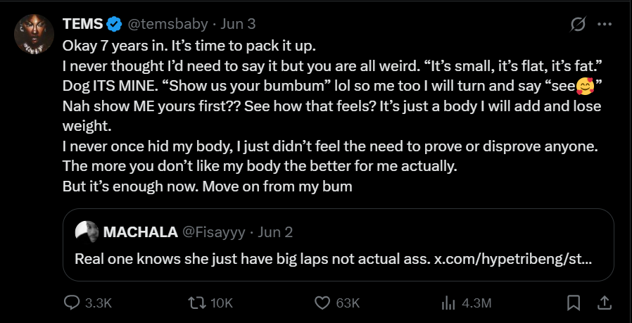 In a post on social media , Tems addressed the relentless remarks about her body being “small,” “flat,” or “fat,” asserting her ownership over her appearance.
