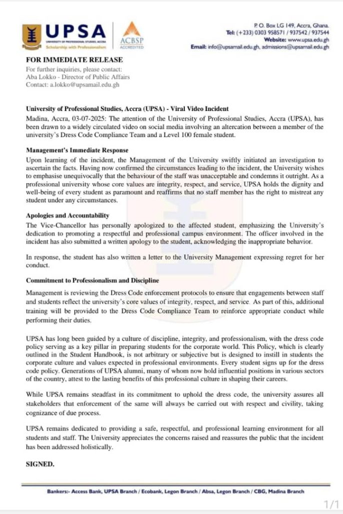 The University of Professional Studies, Accra (UPSA) has strongly condemned an incident captured in a viral video involving a staff member from the Dress Code Compliance Team and a Level 100 female student.