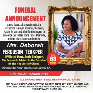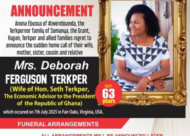 Deborah Ferguson Terkper, wife of former Finance Minister and current Economic Advisor to President John Mahama, Seth Terkper, has passed away.