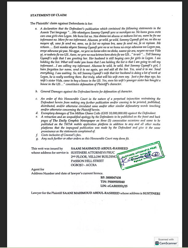In a Statement of Claim filed at an Accra High Court, and sighted by Ghana Weekend on Wednesday July 23, the plaintiff, through his lawyers Sustineri Attorneys PRUC, seeks several reliefs including a declaration that the statements made in the TikTok video constitute defamation, general and exemplary damages to the tune of GHS 10 million, and a perpetual injunction to restrain the defendant from making further defamatory publications.