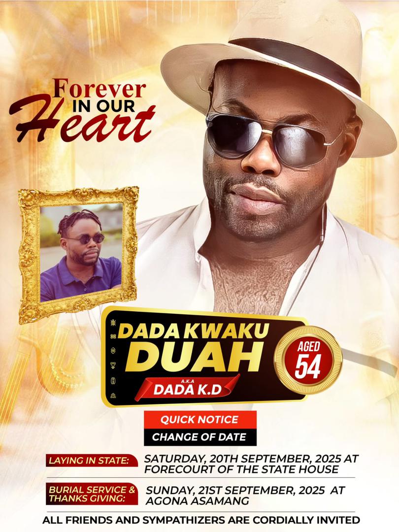 The final funeral rites for Ghanaian Highlife musician Dada KD will begin on Saturday, September 20, 2025, with a Lying in State at the Forecourt of the State House in Accra, his family has announced.