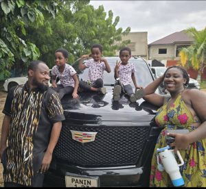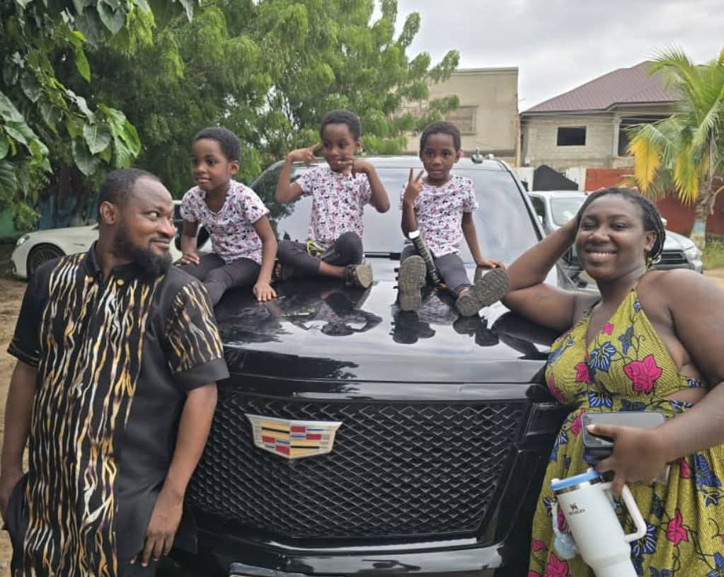 In a Facebook post sighted by GhanaWeekend on Sunday, August 10, 2025, Funny Face shared a touching photo showing him standing beside his three children, who were perched on the bonnet of a car, with Vanessa positioned at the other end.