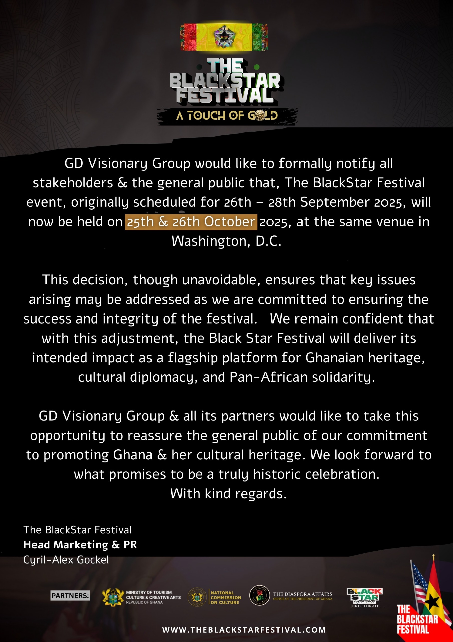The Black Star Festival is a flagship celebration of Ghanaian heritage, cultural diplomacy, and Pan-African unity. Organizers emphasised that the rescheduled dates will enable the festival to fulfill its mission more effectively and deliver a memorable experience for all attendees.